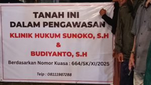 Advokat Sunoko, S.H., menjelaskan bahwa pemasangan plang dilakukan sesuai prosedur. “Untuk saat ini kalau ada orang, oknum, atau institusi yang mengeklaim ini adalah tanah mereka, justru kami akan bertanya balik dasar mereka mengakui tanah ini milik ya apa? Kita bisa argumentasi hukum baik dari bukti, data, dan administrasi tersebut,” ujarnya.