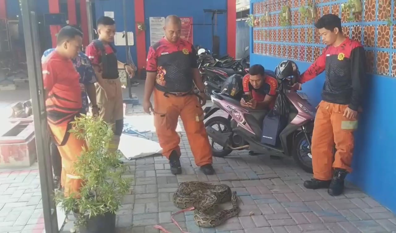 Petugas Damkar berhasil mengevakuasi ular jenis piton berukuran besar yang bersembunyi di bawah lantai teras rumah warga di kawasan Panjang Jiwo Surabaya. Petugas terpaksa membongkar lantai semen untuk menangkap reptil yang membuat warga resah karena kerap memangsa ternak mereka.
