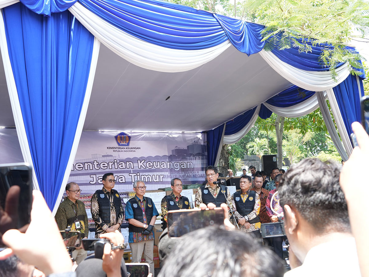 Menkeu Purbaya, dalam lawatannya kali ini juga ikut melaksanakan pemusnahan barang kena cukai ilegal yang dilakukan secara simultan di wilayah kerja Kanwil DJBC Jatim I dan Kanwil DJBC Jatim II.
