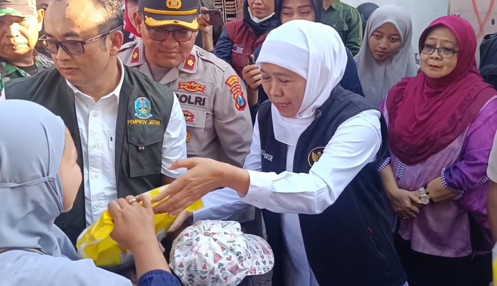 Selain memberikan bantuan, Khofifah juga menggelar pasar murah untuk menjaga stabilitas harga dan memastikan distribusi bahan pokok lancar.